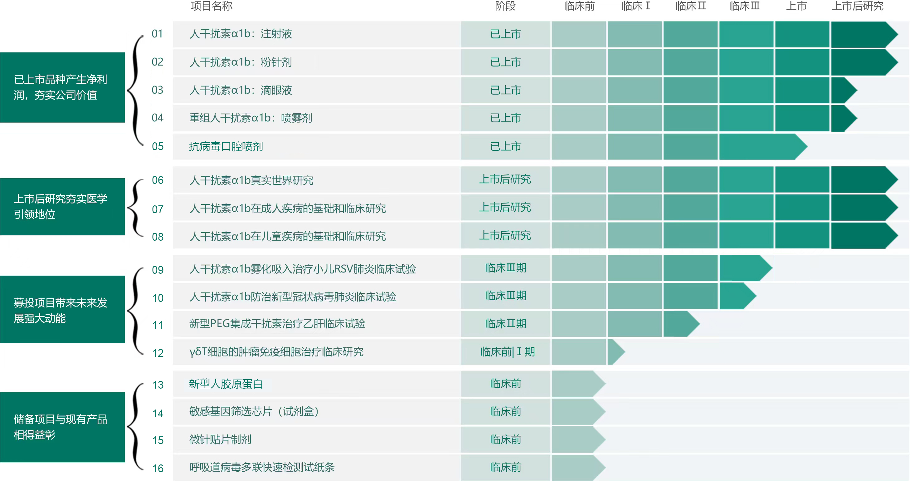 通過大腸桿菌重組蛋白表達系統(tǒng)的載體優(yōu)化、發(fā)酵工藝優(yōu)化與純化工藝優(yōu)化等技術,在國內率先創(chuàng)新制造出包括人干擾素 α1b、α2a、α2b 等在內的多種干擾素亞型,在中國市場上打破了進口干擾素的市場壟斷和價格高企局面。