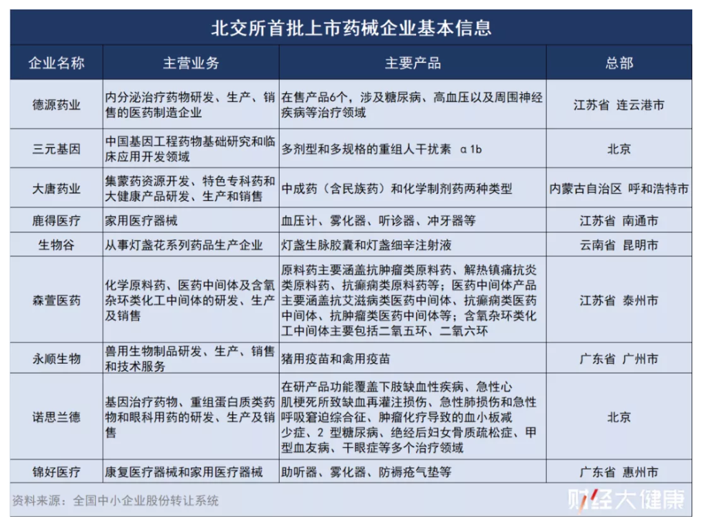 在精選層掛牌的藥械企業(yè)當(dāng)中,還包括德源藥業(yè)、三元基因、大唐藥業(yè)、鹿得醫(yī)療、生物谷、森萱醫(yī)藥、永順生物和諾思蘭德等,涵蓋醫(yī)療器械、創(chuàng)新藥、中成藥、獸用生物制品等多領(lǐng)域。