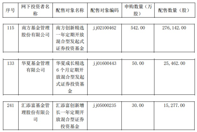 挖貝網(wǎng)注意到,南方、華夏、匯添富3家公募基金參與了三元基因網(wǎng)下配售,共計(jì)獲配31.69萬(wàn)股。其中,“南方創(chuàng)新精選一年定期開放混合型發(fā)起式證券投資基金”獲配27.61萬(wàn)股;“華夏成長(zhǎng)精選6個(gè)月定期開放混合型發(fā)起式證券投資基金”獲配2.55萬(wàn)股;“匯添富創(chuàng)新增長(zhǎng)一年定期開放混合型證券投資基金”獲配1.53萬(wàn)股。