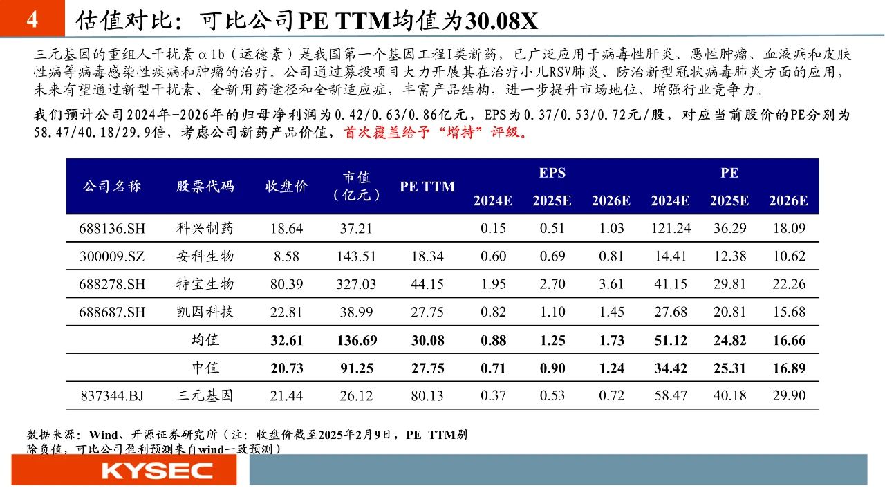 三元基因主要產(chǎn)品為多劑型、多規(guī)格重組人干擾素α1b,該產(chǎn)品為我國第一個具有自主知識產(chǎn)權(quán)的基因工程一類藥物,治療領(lǐng)域覆蓋肝病科、兒科、呼吸科、感染科、皮膚科、眼科、血液科和腫瘤科等多個臨床科室。公司運德素市占率常年領(lǐng)先。公司加強銷售團隊建設(shè),積極恢復(fù)現(xiàn)有市場并努力開拓潛在市場;通過募投項目大力開展干擾素在治療小兒RSV肺炎等方面應(yīng)用,未來有望通過新型干擾素、全新用藥途徑和全新適應(yīng)癥,豐富產(chǎn)品結(jié)構(gòu)。我們預(yù)計公司2024年-2026年的歸母凈利潤為0.42/0.63/0.86億元,EPS為0.37/0.53/0.72元/股,對應(yīng)當前股價的PE分別為58.47/40.18/29.9倍,考慮公司新藥產(chǎn)品價值,給予“增持”評級。