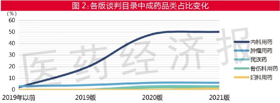 中西藥品類的劃分方式不同,談判目錄中的中成藥以內科用藥為主。而2019年以前占比更大的抗腫瘤用中成藥增長緩慢,從最初的3個增至6個,其中腫瘤輔助用藥一直沒有增長。