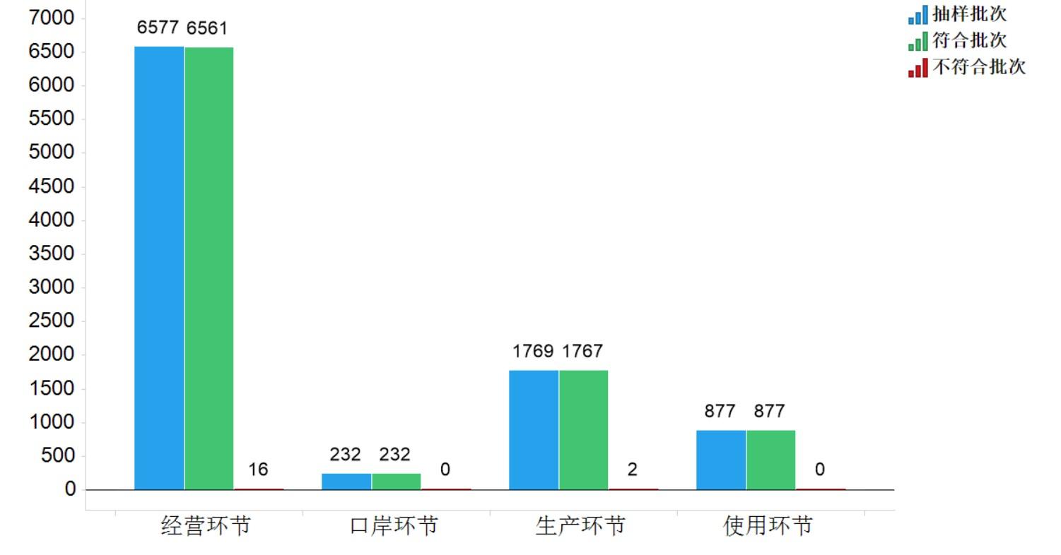 2021年國家藥品抽檢共抽檢化學藥品81個品種9455批次,涉及生產環節1769批次、經營環節6577批次、使用環節877批次、口岸環節232批次。經檢驗,不符合規定18批次,在生產、經營、使用、口岸環節分別檢出不符合規定產品2批次、16批次、0批次和0批次,分別占對應環節全部樣品的0.1%、0.2%、0.0%、0.0%(見圖4)。