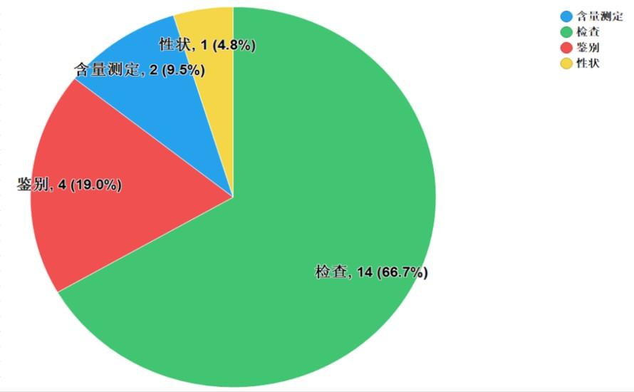 不符合規定項目包括性狀、鑒別、檢查和含量測定,不符合規定產品數量依次為1、4、14和2批次,分別占全部不符合規定項目的4.8%、19.0%、66.7%和9.5%(見圖6)。