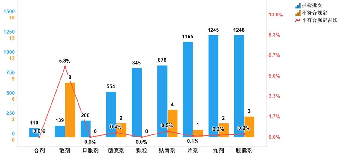 2021年國家藥品抽檢共抽檢制劑產品15899批次。經檢驗,15861批次產品符合規定,38批次產品不符合規定。抽檢的130個品種中,全部樣品符合規定的制劑產品有108個,共12419批次。其中,化學藥品有70個品種7674批次,中成藥有35個品種4681批次,生物制品有3個品種64批次。