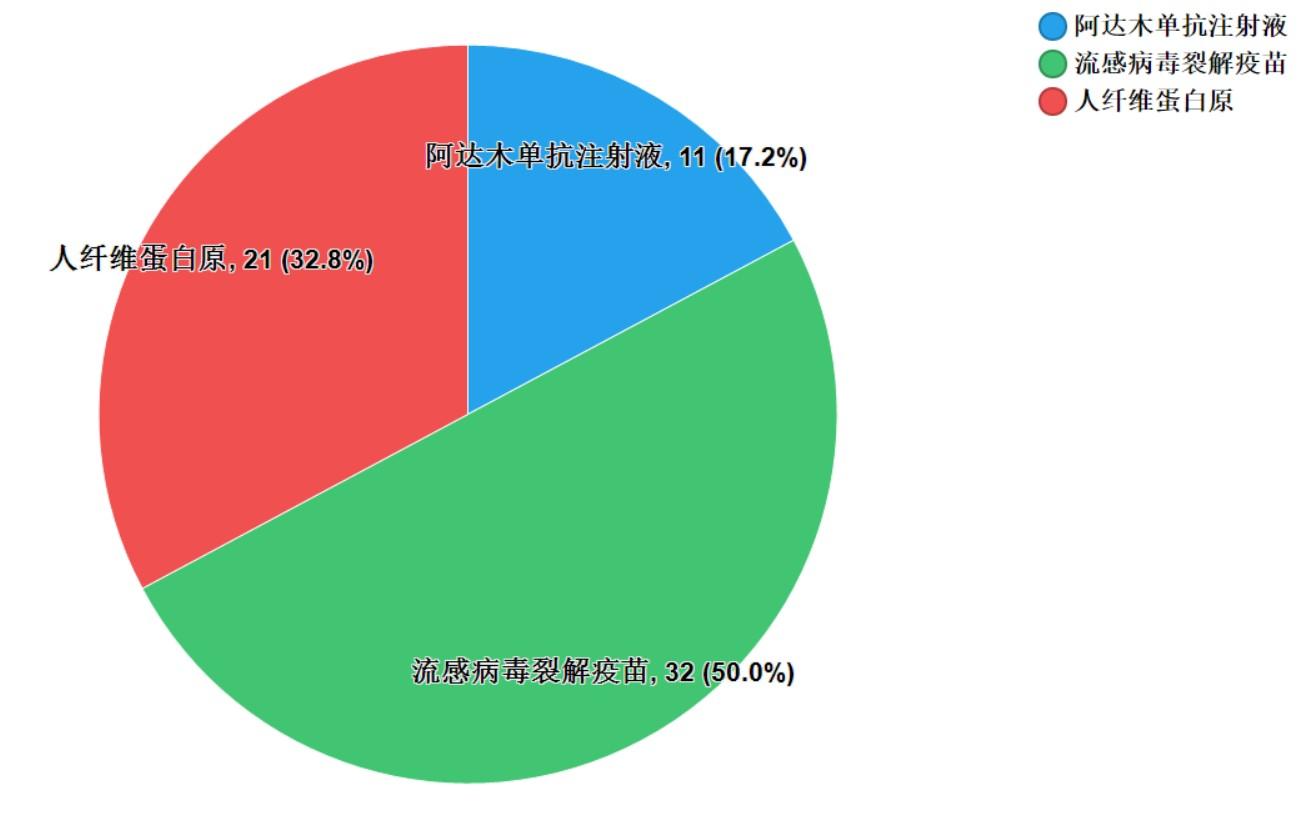 2021年國家藥品抽檢共抽檢生物制品3個品種64批次,其中生產、經營、使用環節分別抽取43批次、20批次、1批次。涉及治療類品種2個,預防類品種1個,劑型均為注射劑(見圖10)。經檢驗,所檢項目均符合規定,合格率為100%。