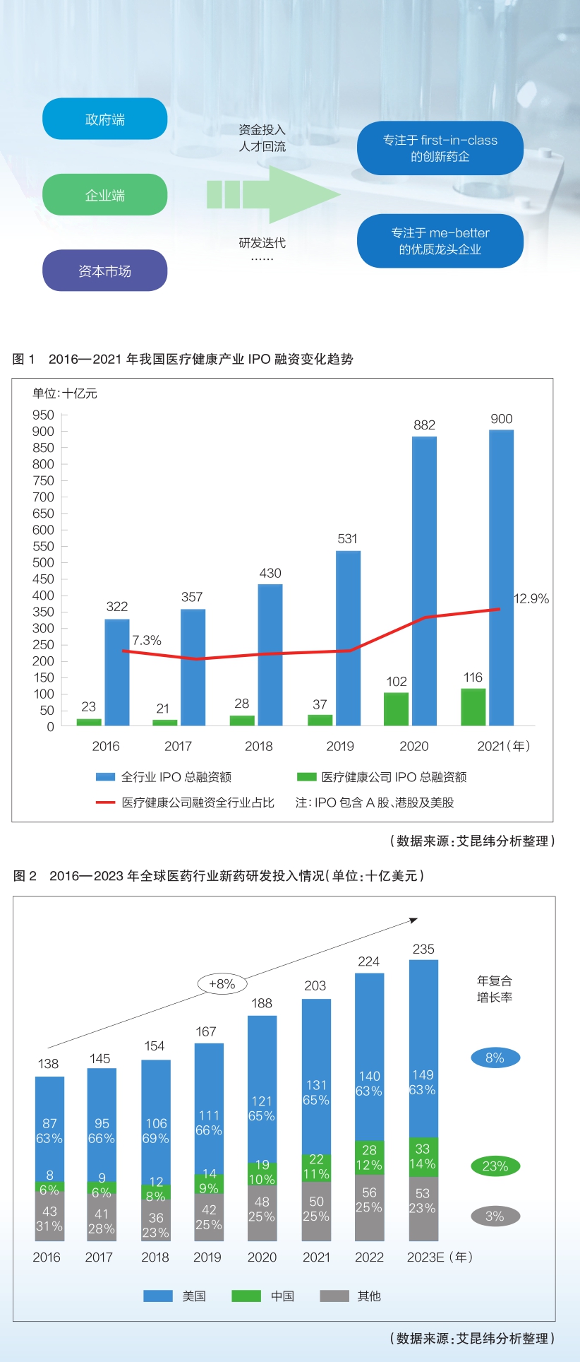 自2015年藥品審評審批制度改革以來,我國醫藥創新政策環境明顯改善。2018年港股“18A”上市新規及2019年上交所科創板的推出,極大豐富了生物醫藥投資退出渠道,快速推高了資本市場對生物醫藥的投資熱情。據艾昆緯統計分析,2021年生物醫藥整體融資額(一級市場+IPO)較2017年增長近3.5倍(醫療健康產業IPO融資變化情況詳見圖1)。但受到監管政策趨嚴、國際環境變化、新冠肺炎疫情反復等因素影響,自2021年四季度起,我國生物醫藥融資急劇放緩,生物醫藥企業一、二級市場表現持續低迷。那么,我國生物醫藥投資是否已見頂?未來五年投資前景如何?