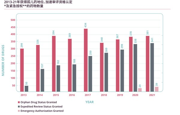 圖3 2013-2021年獲得孤兒藥地位、加速審評資格認定及緊急授權(quán)的藥物數(shù)量(Informa Pharmaprojects, 2022年1月)