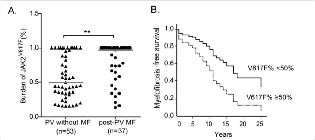 近年來研究統(tǒng)計表明,PV 患者最常見的基因突變是 JAK2-V617F,下圖所示一項研究中,入組 272 例中國 JAK2 突變PV患者的研究結(jié)果表明(圖 1),骨髓纖維化患者中的中位 JAK2 突變負(fù)荷比無骨髓纖維化的PV患者的明顯更高,意味著 JAK2 突變負(fù)荷與骨髓纖維化的進展程度和更嚴(yán)重的脾腫大、更嚴(yán)重的白細(xì)胞增高相關(guān)。并且研究發(fā)現(xiàn)造血干細(xì)胞移植六月后,JAK2 突變陽性的 PV 患者的復(fù)發(fā)率明顯高于 JAK2 突變陰性的患者復(fù)發(fā)率。由此提示,對于 PV 患者,更應(yīng)重視基因突變負(fù)荷,用以指導(dǎo)治療方案的選擇。