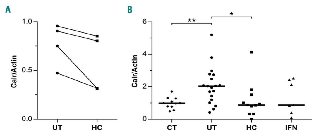 細(xì)胞膜蛋白的研究表明,羥基脲和干擾素 α 影響真性紅細(xì)胞增多癥紅細(xì)胞黏附和膜蛋白表達(圖 2)。使用羥基尿素(HC)和干擾素 α(IFNα)治療后,PV 患者的鈣網(wǎng)蛋白表達顯著降低。