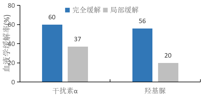 干擾素 α 治療 PV 在內(nèi)的 MPN,97% 患者達到血液學(xué)緩解[5],顯著高于對照組(76%) (P<0.01)。(圖 3)