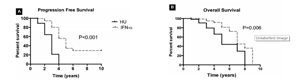 IFNα 治療 PV 在內(nèi)的 MPN,患者疾病無進展生存率以及整體生存率更高,IFNα 與羥基脲治療患者的疾病無進展生存中位時間(IFN-α 和羥基脲組分別為 5.0 年和 3.1 年)(P<0.001)(圖 4A)和整體生存中位時間(IFN-α 和羥基脲組的 7.8 年vs 5.8 年)(P=0.006) (圖 4B)均有顯著改善。